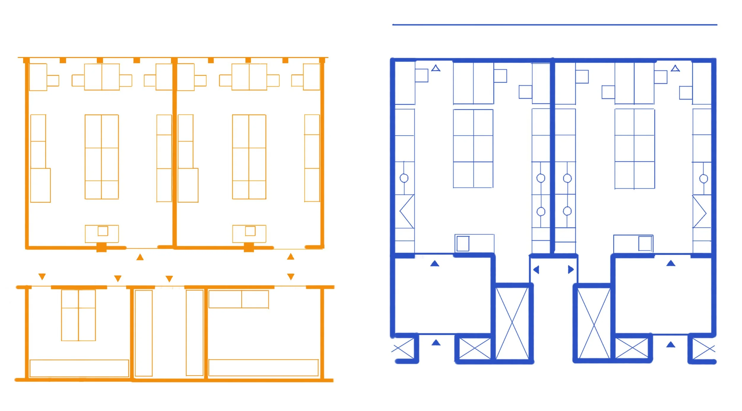 For instance, a 3.2-meter module with 75-centimeter deep benches and a 1.72-meter wide aisle (example on the left) would have 90-centimeter deep hoods protruding 15 centimeters into the aisle, narrowing it down to 1.57 meters, with the hood's corners potentially posing safety hazards by sticking out into the aisle. This issue is particularly concerning in educational labs with students, who may be less experienced than lab professionals, working in the labs. Larger educational practice labs, with more inexperienced traffic in the aisles, should ideally be based on a 7.2-meter module, featuring 90-centimeter deep furniture and consistent 1.7-meter wide aisles to ensure safer working conditions (example on the right).